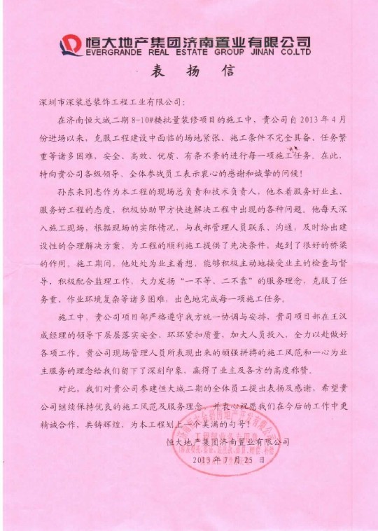 ??? Due to extraordinary performance and positive cooperation in the project, the staff of Jinan Evergrande City Project Department was praised by the client in a commendation letter delivered on July 25, 2013. In particular, the technical supervisor and on-site managerial personnel were highly praised for their serious, responsible and positive working attitude.